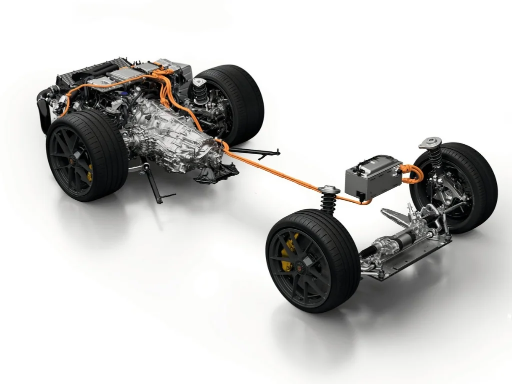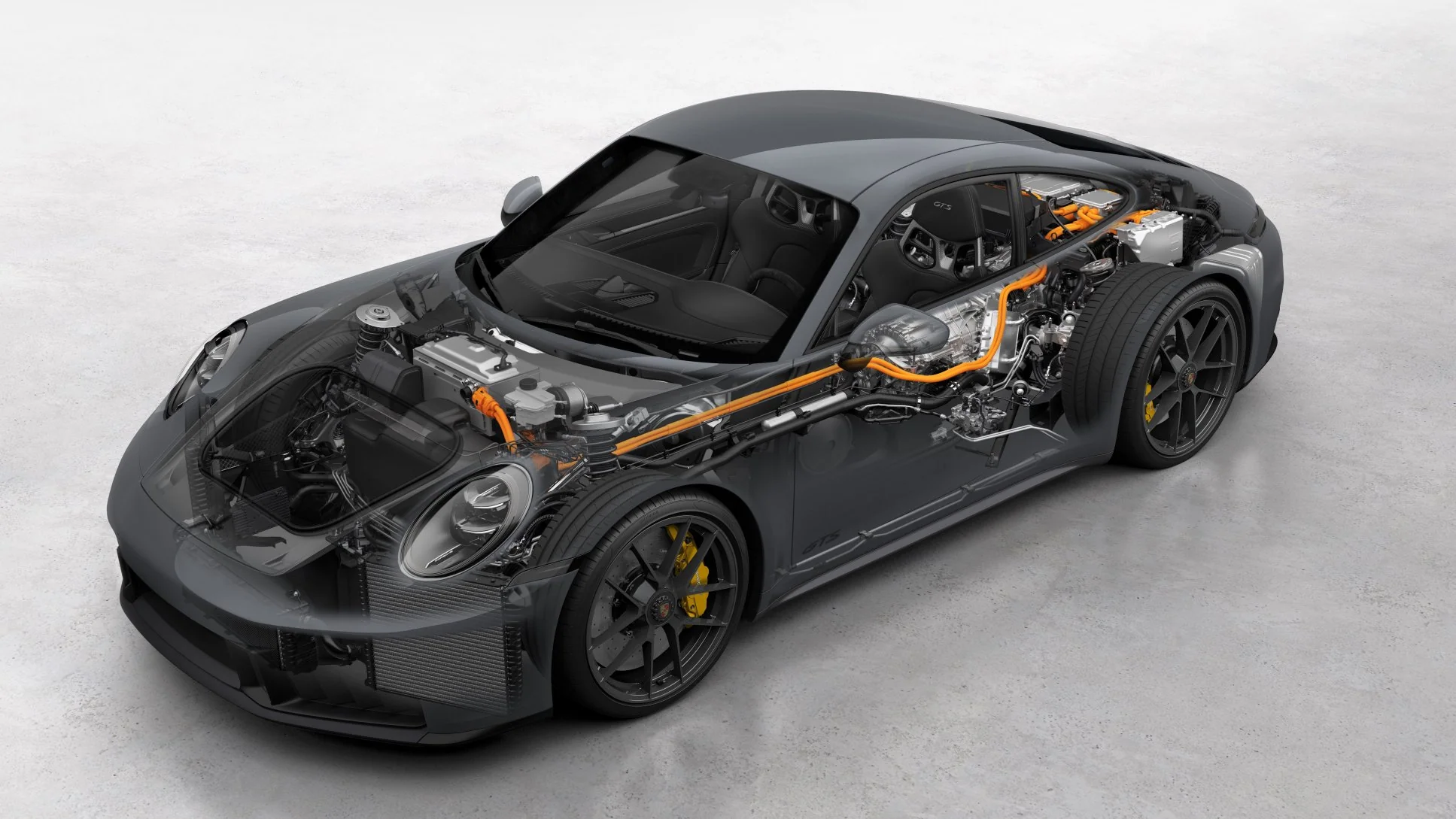 Nesta visão estrutural, é possível ver o motor traseiro integrado ao câmbio PDK, a suspensão esportiva, a distribuição de peso ideal e o sistema elétrico de alta voltagem percorrendo o chassi com precisão.